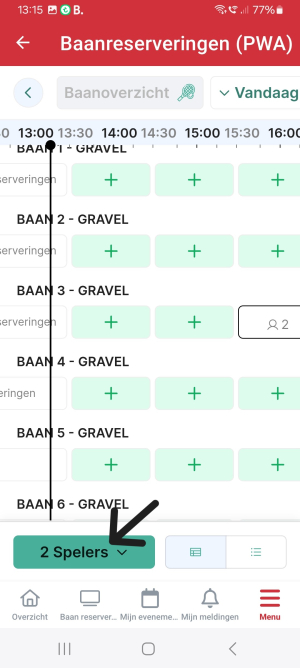 - Je vult als eerste het aantal spelers in (zie zwarte pijl). Het aantal spelers dat je de vorige keer hebt gebruikt wordt in de volgende reservering weer weergegeven, maar dat kan je makkelijk aanpassen.