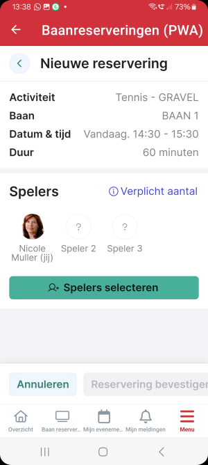 1. Je ziet staan dat jij de baan hebt gereserveerd en je voegt je tennispartner(s) toe al naar gelang het aantal opgegeven spelers (2,3 of 4).