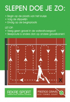 Om het afschot te behouden, moet er in lengterichting worden gesleept. Dit is anders dan bij traditionele gravelbanen. Raadpleeg de tekening voor de juiste techniek.