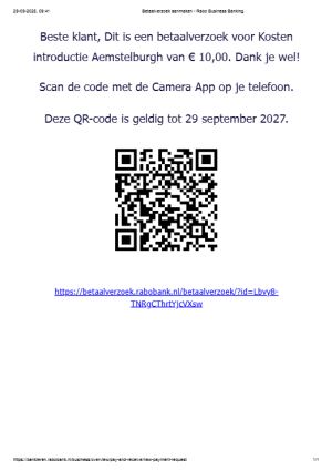 - De kosten van een introductie bedragen 10 euro per keer. Dit bedrag kan je betalen door deze QR code te scannen of te betalen via deze link. Dan word je doorverwezen naar een betaling van 10 euro direct op de clubrekening van Aemstelburgh. Er hangt ook een QR code in het halletje bij het afhangbord. naast de bestuurskamer.